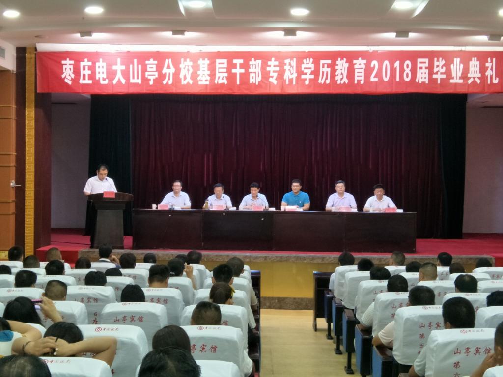 7月12日上午,枣庄电大山亭分校基层干部专科学历教育2018届毕业典礼在山亭宾馆隆重举行。枣庄市委组织部远教中心主任苑永利、英国beat365官方网站英国beat365官方网站副院长王奉涛、区委组织部区委党校有关领导出席,区委党校全体教职工及109名学员共同参加了本次典礼。典礼由区委党校党委书记、常务副校长满孝东主持。