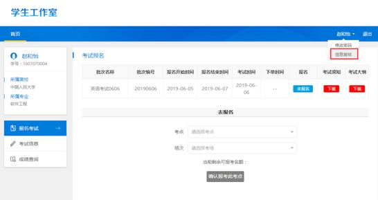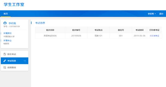 学生点击“考试信息”,可以查看其报名考试的时间、地点等,并且可以点击“打印准考证”,打印个人的准考证 。