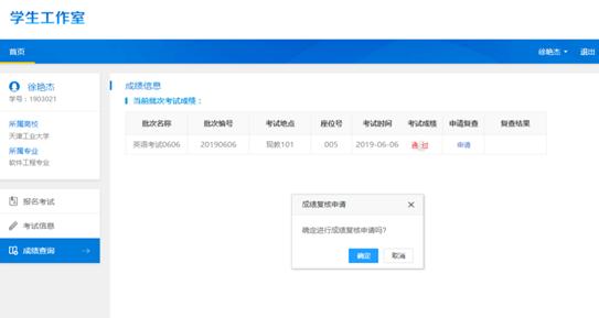 针对未通过但是对成绩存在质疑的学生,则可以点击“申请”,进行成绩复核,点击确定即完成了一次成绩复查申请。