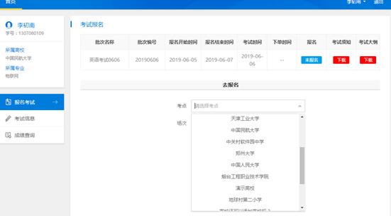 当学生报名时,即可选择某一个考点,及此考点的某一场次,进行报名。每一场有可容纳的考生数量,本考点当前场次报名数量未满时,无法报名下一场次。当本考点当前场次报名人数已满,考生也无法再报考当前考点的当前场次。