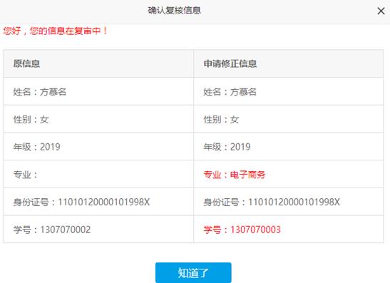 若信息有误,则在信息栏右侧输入更正后的信息,并点击“申请复核”,提交复核信息。如下为点击后,信息确认的页面,针对申请复核的信息,高亮显示。