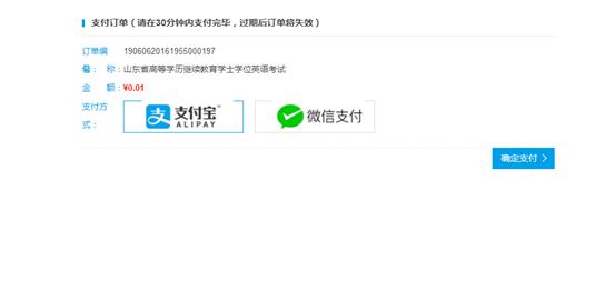 点击“确认报考次考点”后,进入订单页面,支持进行支付宝支付或者微信支付两种形式,可自由选择,当所选方式外边框标为蓝色,即为当前选中的缴费方式,点击“确定支付”,即进入支付页面。