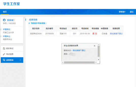 学生可实时查看成绩复查的审核状态,对于审核不通过的,学生可点击状态“高校复查不通过”字样,查看审核未通过的原因。