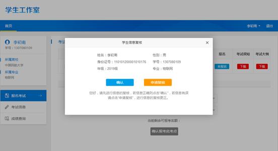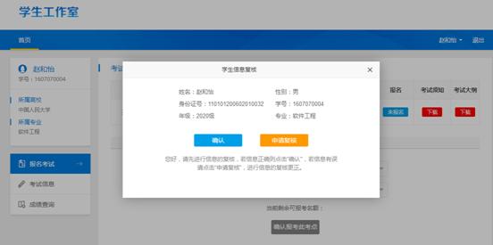 学生首次登陆工作室,未对个人信息进行过复核的学生,其登录工作室后,系统自动弹出信息核对的页面,若信息无误,则点击“确认按钮。