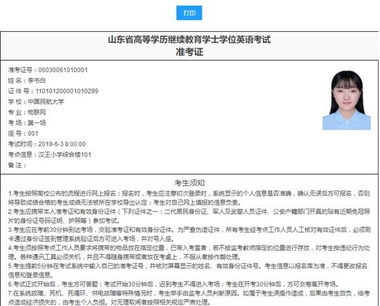 点击“打印准考证”后,显示如下页面,学生进入准考证详情页面后,点击“打印”,即可自动链接打印机,完成打印。