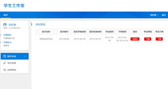 点击“报名考试”栏目,即可看到当前批次的考试信息,并且点击下载,即可完成考试须知,考试大纲的下载浏览。